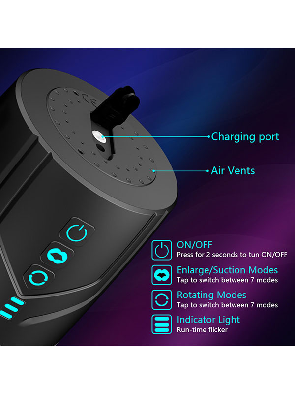 Bu erkek mastürbatörü, 7 dönüş modu ve 7 emme modunu bir arada sunar. İki fonksiyon ayrı ayrı kontrol edilir ancak birlikte çalışır; dönüş fonksiyonu, 3 boyutlu dokulu iç kesesinin dönmesini sağlayarak penis başını farklı hızlarda uyarır. Farklı seviyelerde oral emme deneyimini simüle ederek, boşalana kadar yoğun bir zevk sağlar.